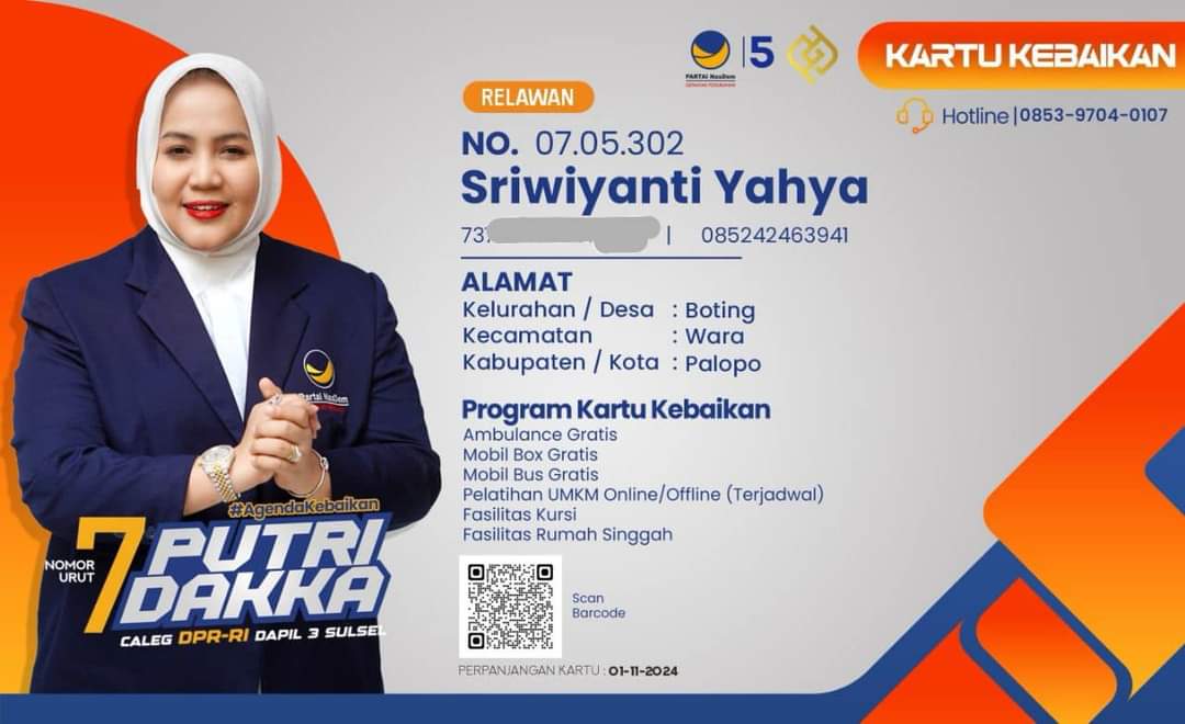 “Kartu dengan nomor relawan kode barcode yang tidak bisa diduplikasi ini. Dari sinilah Putri ke depan menyalurkan hobi berupa agenda kebaikan Putri yang saat ini masih tertahankan karena keadaan dimana Putri terdaftar sebagai caleg,” ulasnya.