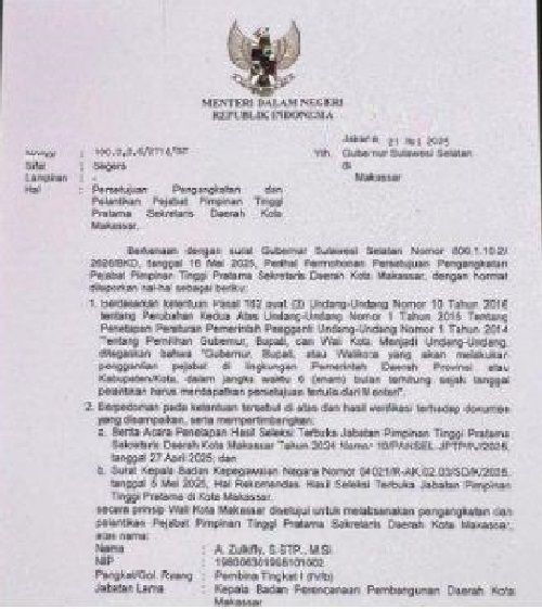Pada informasi yang beredar, surat tersebut bernomor: 100.2.2.6/2714/SJ terkait persetujuan pengangkatan dan pelantikan pejabat pimpinan tinggi pratama Sekda Makassar yang diteken Tito Karnavian. Surat itu ditujukan ke Gubernur Sulsel Andi Sudirman Sulaiman yang diterbitkan pada 21 Mei 2025.