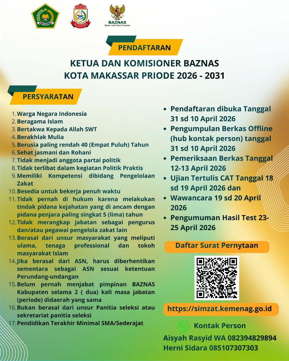 “Kami mengundang seluruh masyarakat yang memiliki kompetensi dan memenuhi persyaratan untuk berpartisipasi dalam seleksi pimpinan BAZNAS Kota Makassar,” ujarnya.