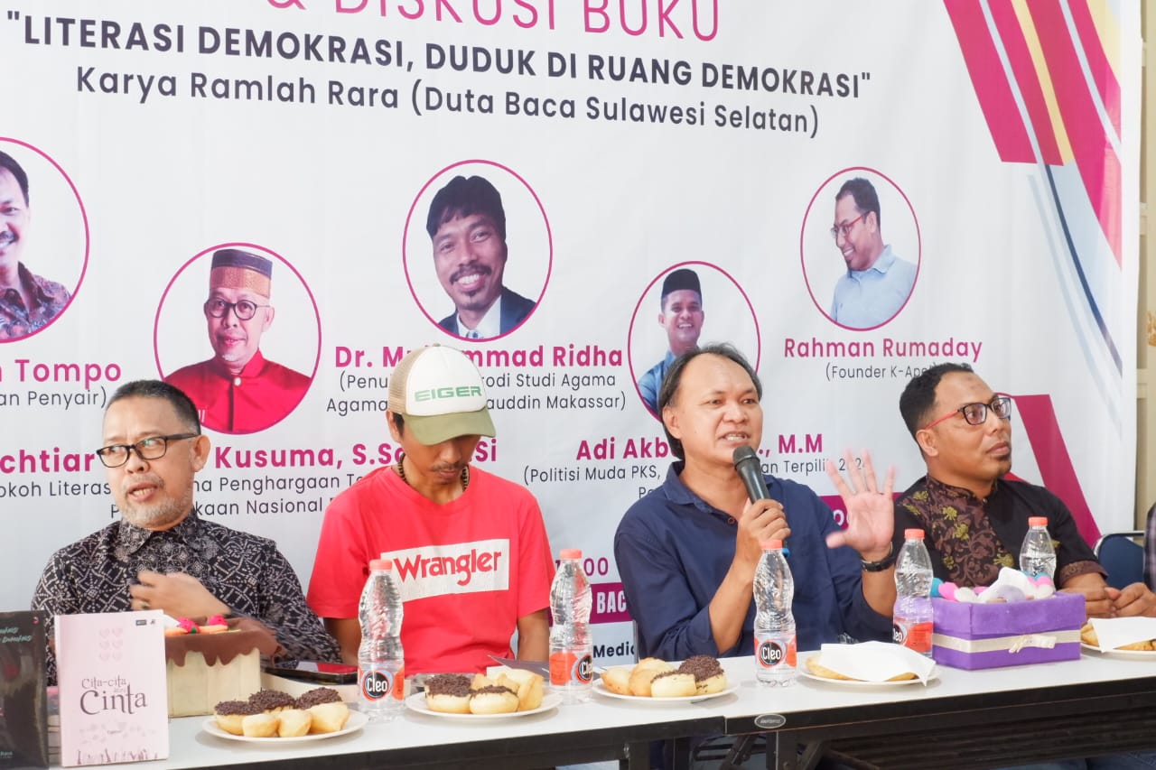 Silaturahmi di Kafe Baca ini, dalam rangka launching buku ketiganya, berjudul “Literasi Demokrasi, Duduk di Ruang Demokrasi”. Pembicara selain saya, ada Rahman Rumaday, pegiat literasi dan Founder K-Apel (Komunitas Anak Pelangi), Dr Muhammad Ridha, penulis dan Ketua Prodi Studi Agama-Agama FUFP UIN Alauddin Makassar, Bachtiar Adnan Kusuma, pegiat literasi dan penerima penghargaan Nugra Jasa Dharma Pustaloka dari Perpustakaan Nasional RI, serta Adi Akbar, politisi muda PKS Kota Makassar.