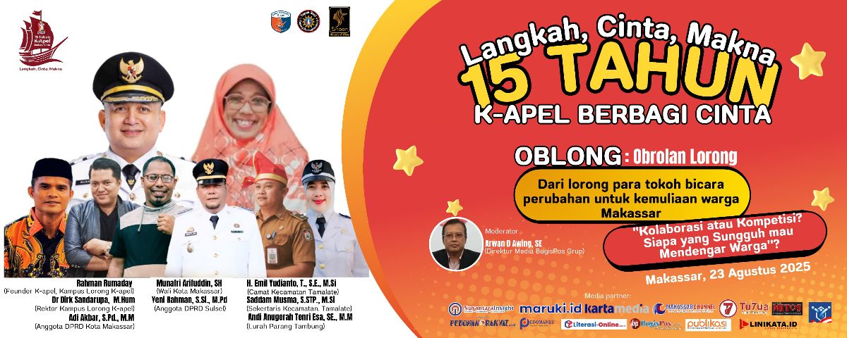 NusantaraInsight, Makassar — Besok, Sabtu 23 Agustus 2025, Wali Kota Makassar Munafri Arifuddin dijadwalkan menghadiri perayaan Syukuran 15 Tahun K-apel Berbagi Cinta dengan tema “Langkah, Cinta, Makna” yang digelar di pusat pengembangan potensi masyarakat Lorong Daeng Jakking, Kelurahan Parang Tambung, Kecamatan Tamalate, Jum’at, (22/8/2025)
