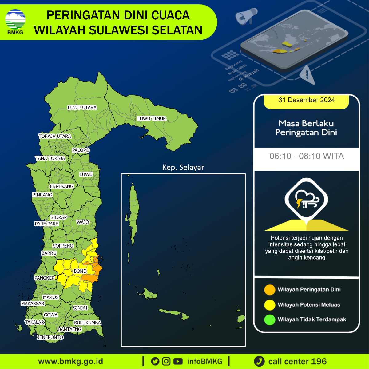 Dalam rilis yang dikeluarkan BMKG pkl. 05:40 WITA berpotensi terjadi hujan dengan intensitas sedang hingga lebat yang dapat disertai kilat/petir dan angin kencang pada pkl 06:10 WITA di dua kabupaten di Sulsel.