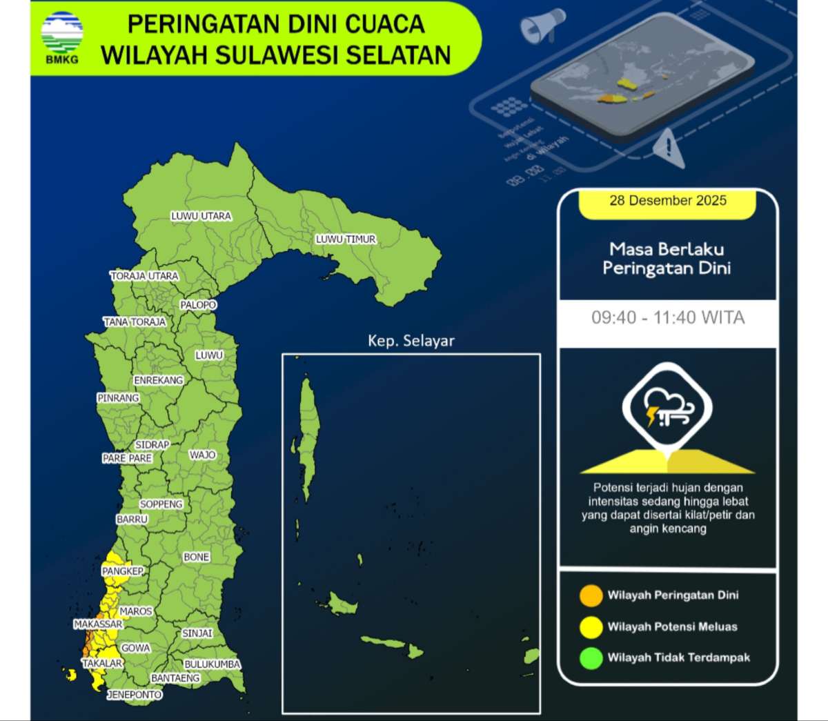 NusantaraInsight, Makassar — Badan Meteorologi Klimatologi dan Geofisika (BMKG) mengeluarkan Peringatan Dini Cuaca Wilayah Sulawesi Selatan, hari ini Minggu tanggal 28 Desember 2025.