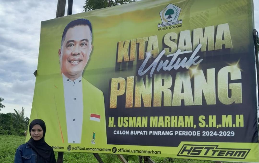 Salah satu baliho yang marak dan menyebar di Pinrang adalah, baliho milik Ketua DPD Partai Golkar Pinrang, H.Usman Marham SH MH dipotret Selasa 4 Juni 2024 di Jalan Poros Pinrang Polman, samping Masjid Al-Mujabah Musti, Desa Katomporang, Kecamatan Duampanua, Pinrang.
