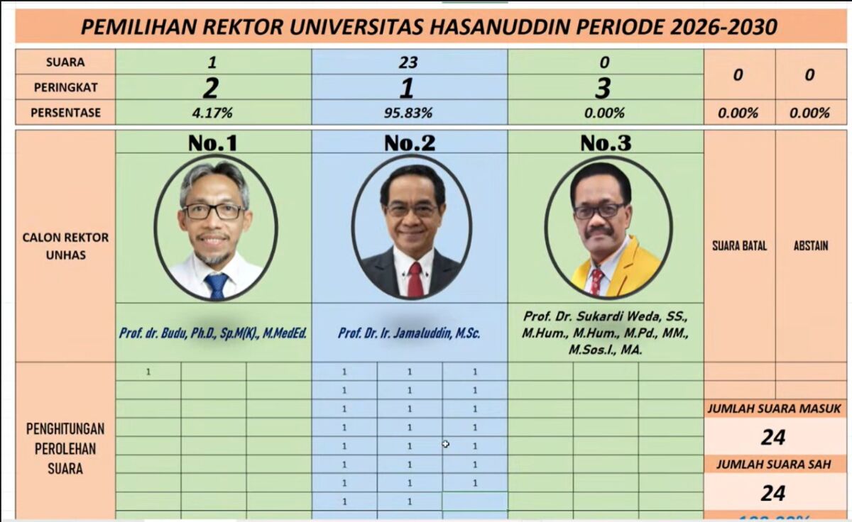 ​Sementara itu, dua kandidat lainnya, yakni Prof. dr. Budu, Ph.D., Sp.M(K)., M.MedEd., memperoleh 1 suara, dan Prof. Dr. Sukardi Weda, SS., M.Hum., tidak memperoleh suara pada pemilihan tahap akhir tersebut.