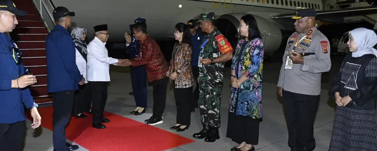 NusantaraInsight, Jayapura — Usai menempuh penerbangan sekitar 3 jam 25 menit, pada 19.55 WIT Wakil Presiden (Wapres) Ma’ruf Amin beserta Ibu Hj. Wury Ma’ruf Amin tiba di Bandara Sentani Jayapura, Papua, Senin (09/10/2023). Wapres disambut oleh Pj. Gubernur Papua Ridwan Rumasukun dan Anggota Forum Koordinasi Pimpinan Daerah Provinsi Papua.