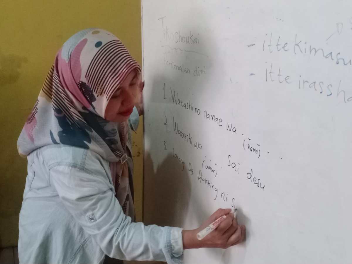 Pada pertemuan kedua ini, peserta mempelajari “Jikoshoukai” atau cara memperkenalkan diri dalam Bahasa Jepang. Mereka diajarkan bagaimana menyebutkan nama, usia, dan tempat tinggal. Suasana kelas terasa hidup saat setiap peserta antusias mencoba memperkenalkan diri dengan Bahasa Jepang. Kesalahan kecil yang terjadi justru menambah keceriaan proses belajar. “Watashi wa Rini desu. Juusan sai desu,” ujar seorang Hafiz dengan percaya diri, meski masih terbata-bata.