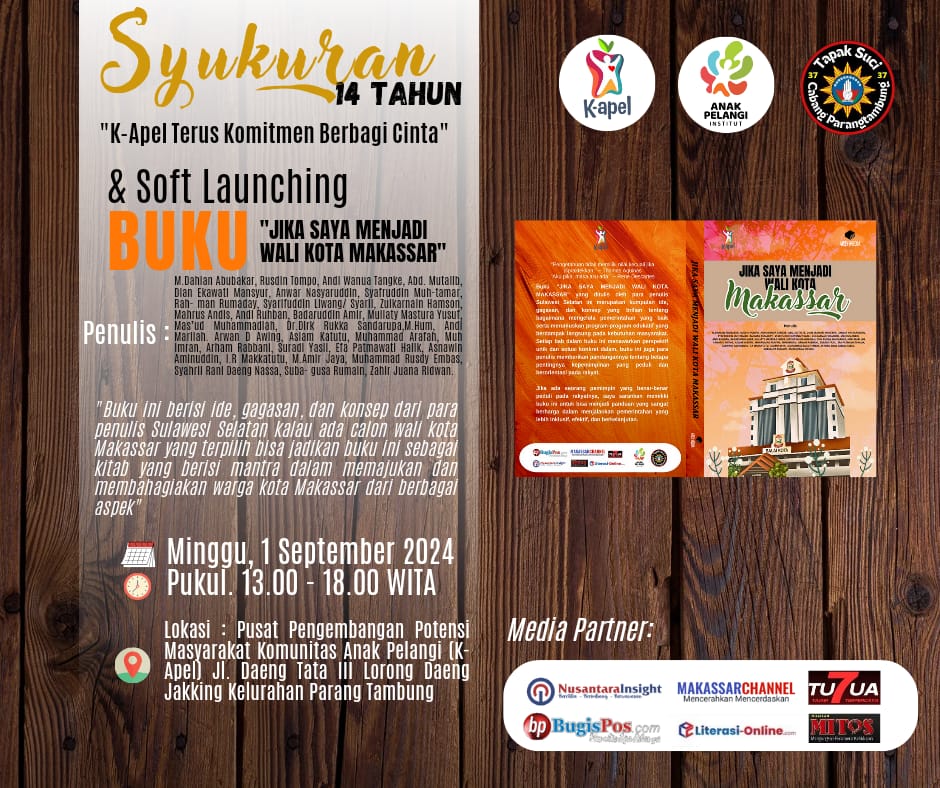 NusantaraInsight, Makassar — Komunitas Anak Pelangi (K-Apel) akan mengadakan acara syukuran hari jadi ke-14 dengan tema “14 Tahun K-Apel Terus Komitmen Berbagi Cinta” pada tanggal 1 September 2024. Acara ini akan berlangsung di Pusat Pembinaan Potensi Masyarakat K-Apel, yang terletak di Jl. Daeng Tata III Lorong Daeng Jakking, Kelurahan Parang Tambung, Kecamatan Tamalate, Kota Makassar, Sulawesi Selatan. Syukuran ini akan dirangkaikan dengan acara soft launching buku yang berjudul “Jika Saya Menjadi Wali Kota Makassar,” sebuah karya kolaboratif yang ditulis oleh 31 penulis dari Sulawesi Selatan. Rabu, 21/8/2024