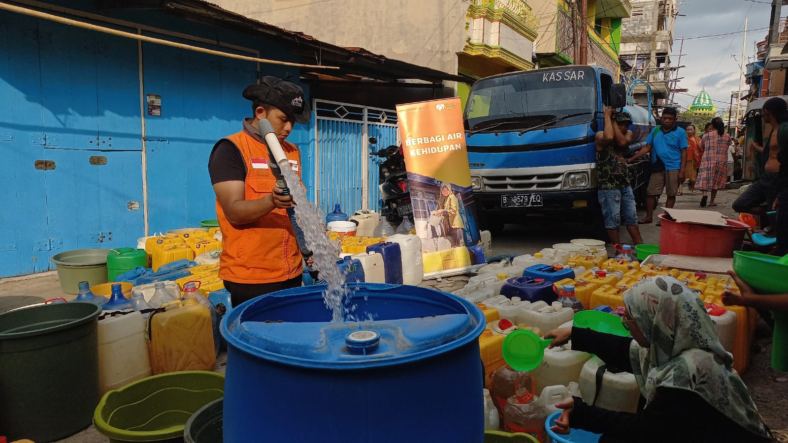 Tim relawan Rumah Zakat mendistribusikan bantuan air bersih ke warga yang terkena dampak air PDAM yang tidak mengalir. Sebanyak 20.000 ribu liter air di bagikan untuk memenuhi kebutuhan air bersih bagi warga kota Makassar
