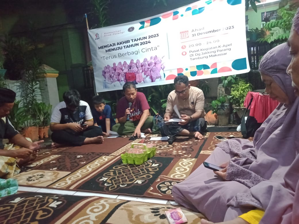 Kegiatan ini, mengambil tema “Tahun 2024 Terus Berbagi Cinta,” pada momen spesial tersebut diawali dengan zikir dipimpin oleh Daeng Agi, salah satu ibu binaan K-Apel. Dilanjutkan dengan kultum renungan muhasabah 12 bulan selama tahun 2023 disampaikan oleh founder K-Apel, Rahman Rumaday.