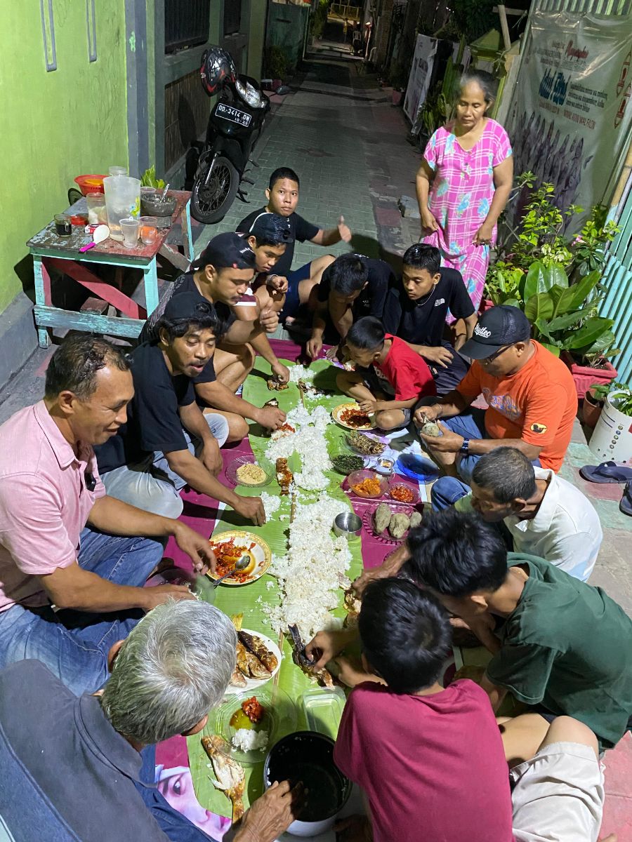 Berbeda dari acara makan bersama pada umumnya, mereka duduk melantai di lorong dengan beralaskan spanduk bekas dan menggunakan daun pisang sebagai pengganti piring. Nasi di hambur dengan rapi sepanjang daun pisang disertai ikan sayur tersaji rapi di atas daun pisang, memperlihatkan kearifan lokal serta rasa kebersamaan yang kental di antara mereka.