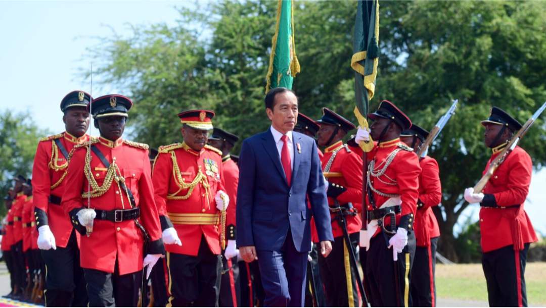 Cuaca cerah tepi pantai mengiringi upacara penyambutan kenegaraan. Tiba sekira pukul 10.00 waktu setempat (WS) atau 14.00 WIB, Presiden Jokowi disambut secara langsung oleh Presiden Samia di halaman depan Dar Es Salaam State House.