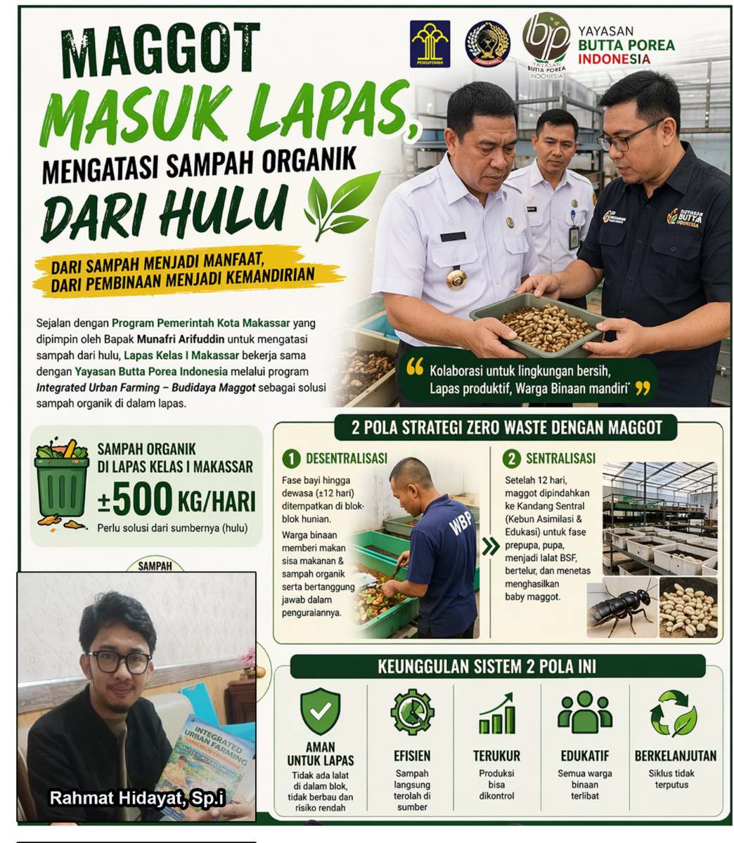 Salah satu langkah konkret diwujudkan melalui kolaborasi antara Yayasan Butta Porea Indonesia dengan Lapas Kelas I Makassar dalam program Integrated Urban Farming, khususnya pada sektor budidaya maggot sebagai solusi pengolahan sampah organik.