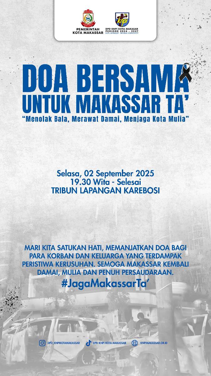 Agenda doa bersama tersebut dijadwalkan berlangsung pada Selasa (2/9/2025) pukul 19.30 WITA di Tribun Lapangan Karebosi.