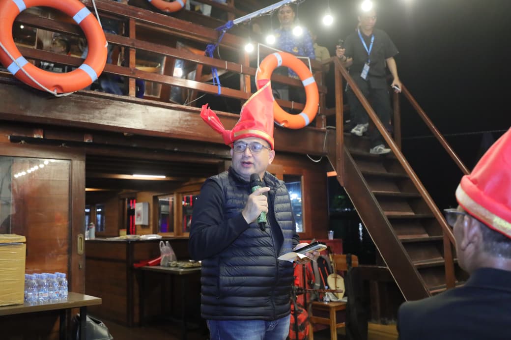 Dalam agenda ACRS 2025 Cultural Dinner yang digelar di atas Kapal Pinisi sambil berlayar di perairan Pantai Losari, Selasa (28/10/2025) malam, Wali Kota Munafri, didampingi Kepala Dinas Komunikasi dan Informatika (Diskominfo) Kota Makassar, Dr. Muhammad Roem.