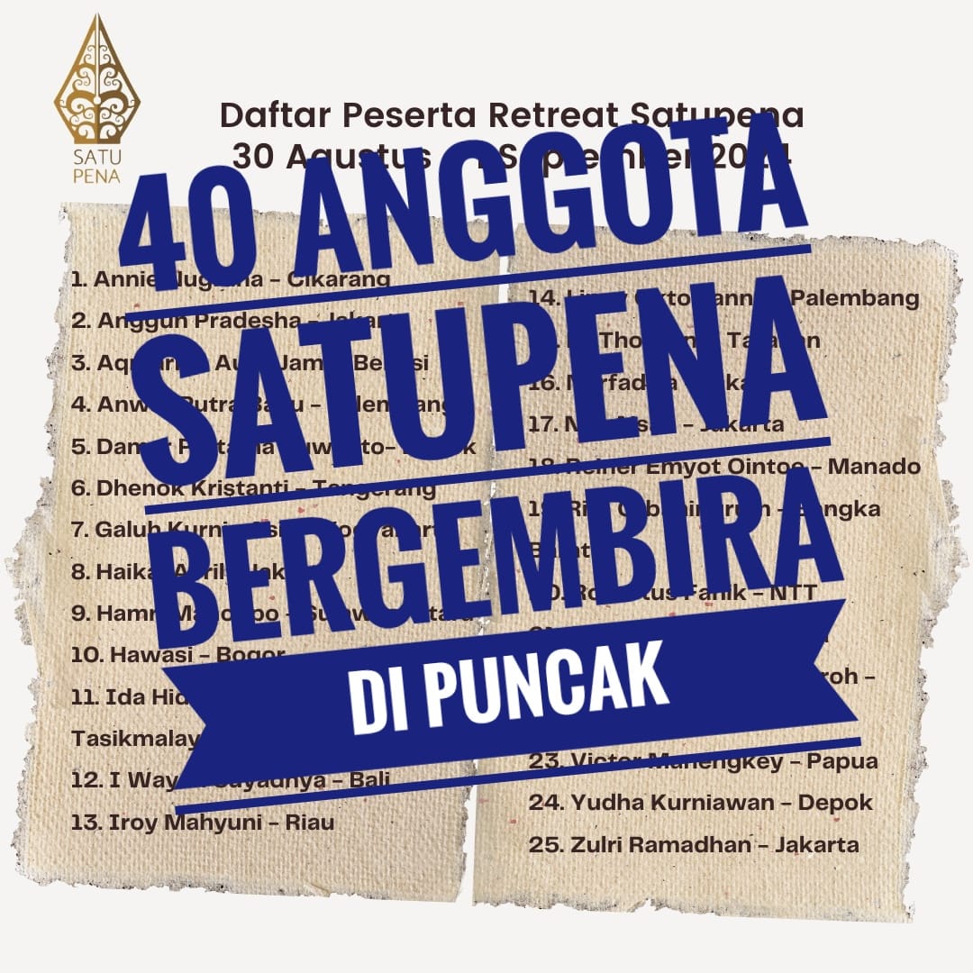 NusantaraInsight, Jakarta — Satupena memperingati Hari Kemerdekaan Indonesia ke-79 dengan menulis buku bersama 40 penulis yang datang dari Sumatra hingga Papua. Penulisan berlangsung di Puncak, Bogor, selama 3 hari (30 Agustus-1 September 2024). “Ini baru pertama kali terjadi di Indonesia,” kata Denny JA, Ketua Umum Perkumpulan Penulis Indonesia Satupena, Jumat, di Jakarta.