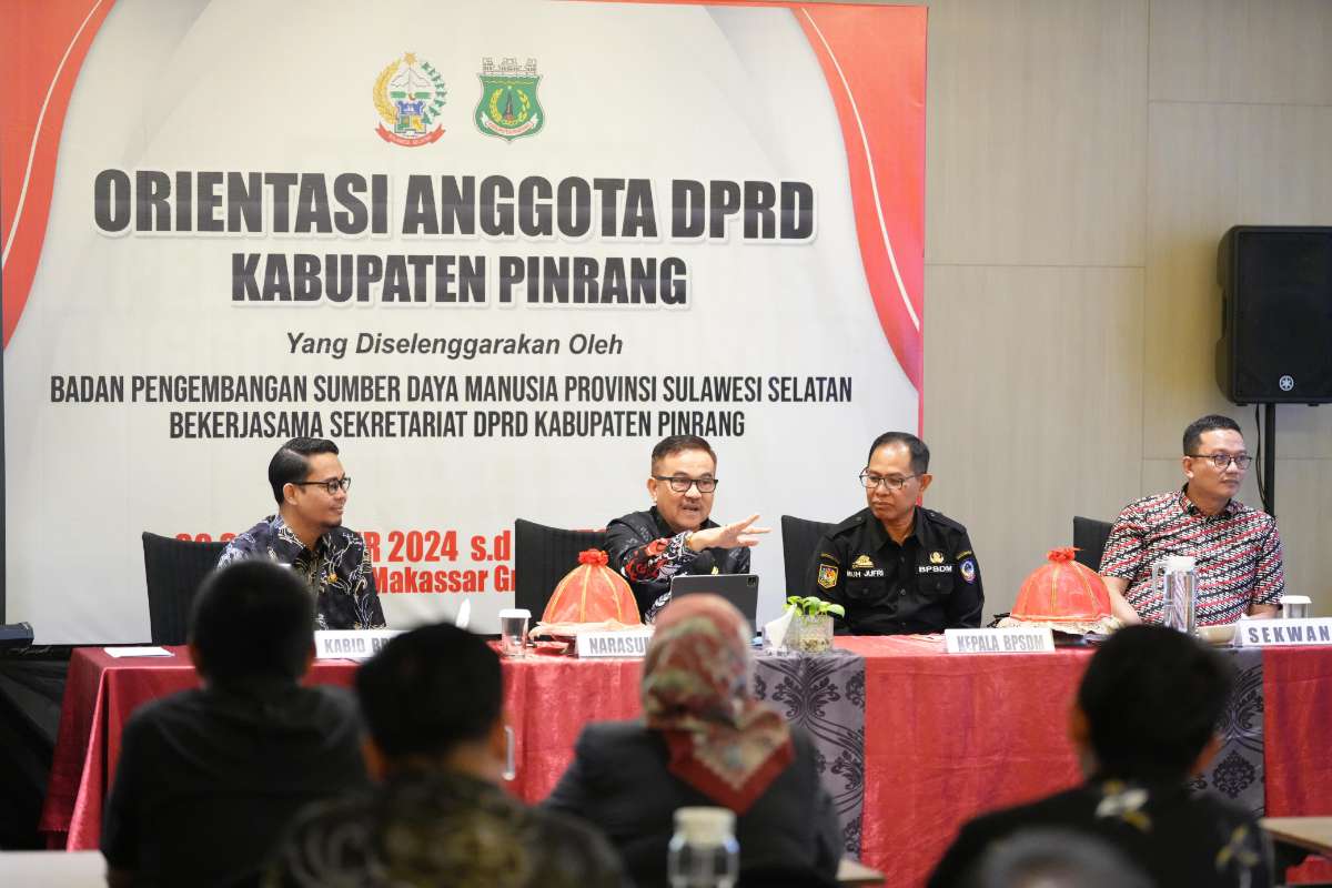 NusantaraInsight, Makassar — Sekretaris Daerah Provinsi Sulsel Jufri Rahman menghadiri sekaligus menutup secara resmi Orientasi Anggota DPRD Kabupaten Pinrang yang diselenggarakan oleh Badan Pengembangan Sumber Daya Manusia (BPSDM) Provinsi Sulsel yang dilaksanakan di Hotel Novotel Makassar, Kamis, 3 Oktober 2024.