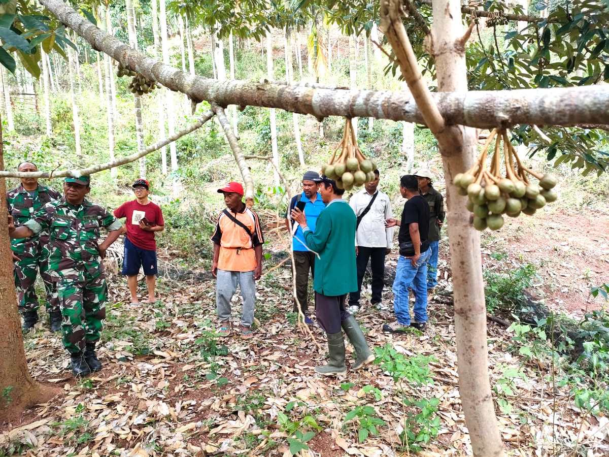 Setelah meluncur sekitar 3km dalam waktu sekitar 30 menit, kami tiba di tujuan. Suasananya begitu adem. Hutan kemiri, durian, rambutan, dan pinang yang ditanam beberapa tahun lalu sudah menghasilkan. Kemiri sedang berbuah. Durian pun berbunga, sementara pinang pun berbuah. Pinang malah memberikan profit ganda. Selain buahnya, pelepahnya bernilai uang.