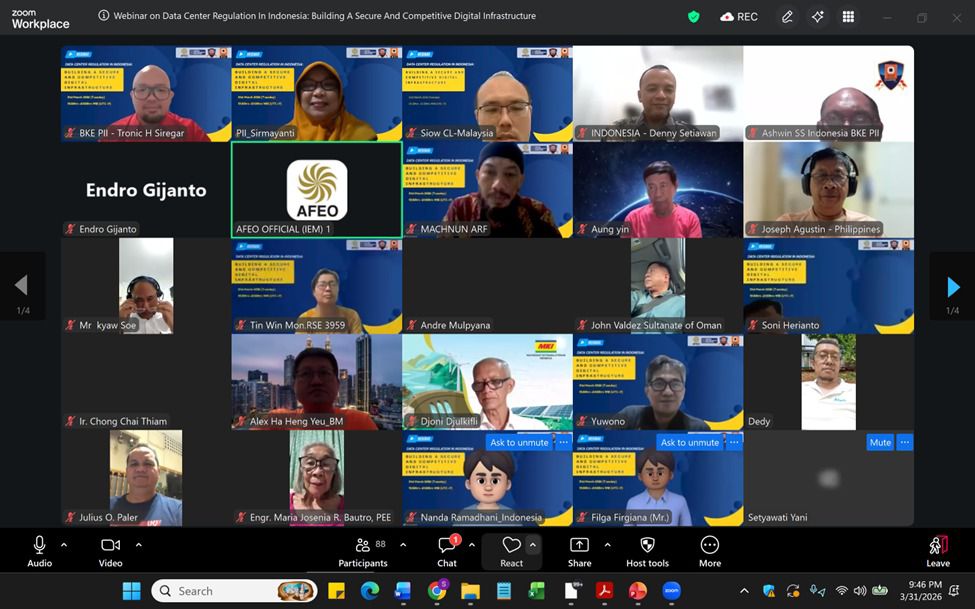 Webinar ini menghadirkan narasumber utama, Dr. Ir. Denny Setiawan, Director of Digital Infrastructure Strategy and Policy, Kementerian Komunikasi dan Digital (KOMDIGI) Republik Indonesia. Kegiatan ini dipandu oleh Assoc. Prof. Ir. Sirmayanti, IPU, ASEAN Eng, APEC Eng selaku Head of Indonesian Representative AEI – Electrical Installation serta Vice Chair for Institutional Relations and Regulatory BKE PII, serta dosen aktif di Politeknik Negeri Ujung Pandang, dan dibuka secara resmi oleh Ir. Dr. Siow Chun Lim, Chairman of ASEAN Engineering Inspectors (AEI) – Electrical Installation.