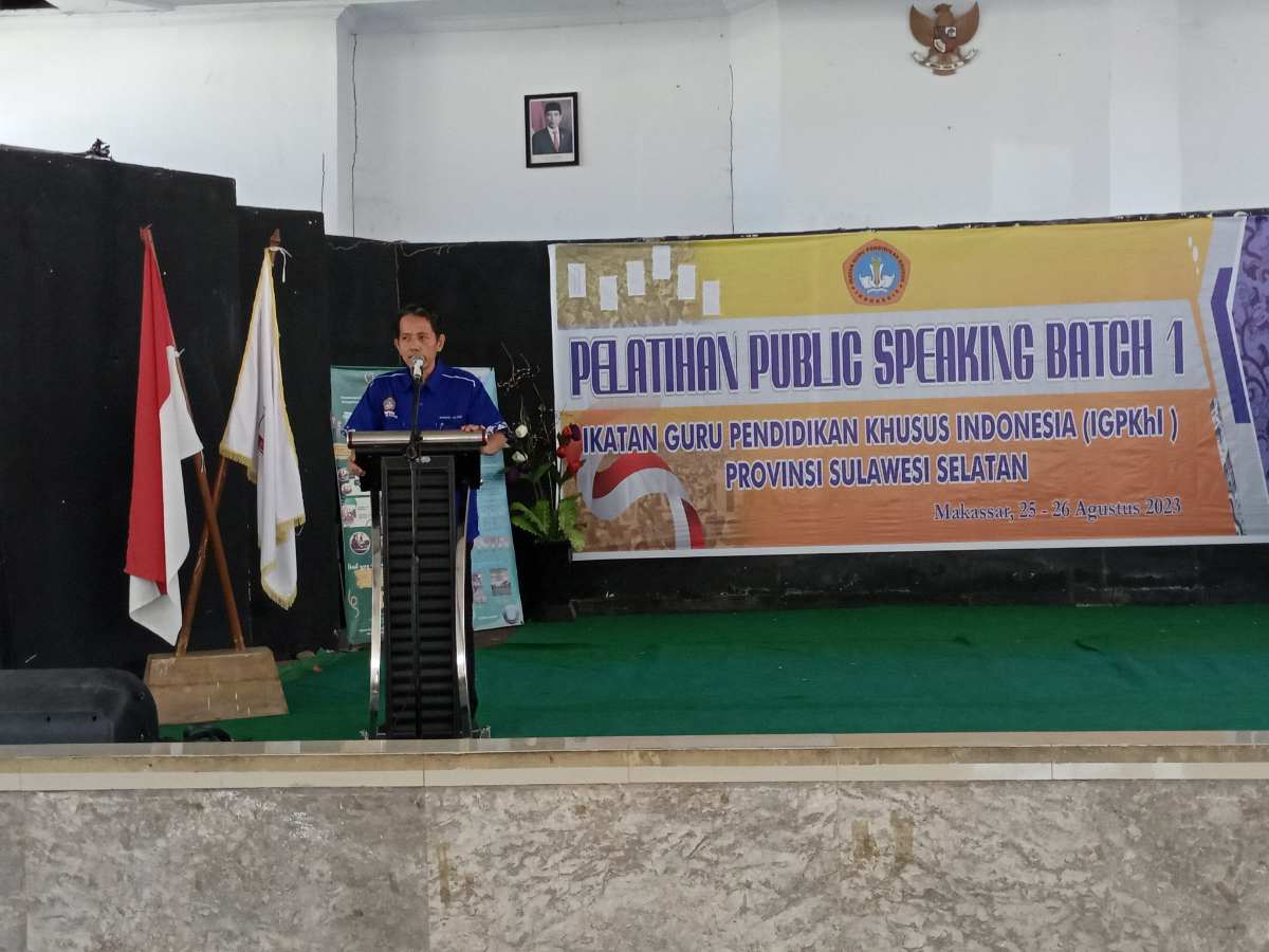Ketua Pengurus Daerah (PD) IGPKhI Sulawesi Selatan Jamaluddin, S.Pd.,M.Pd dalam sambutannya menyampaikan bahwa pelatihan public speaking untuk para guru SLB sangat penting artinya bagi peningkatan kompetensi guru.