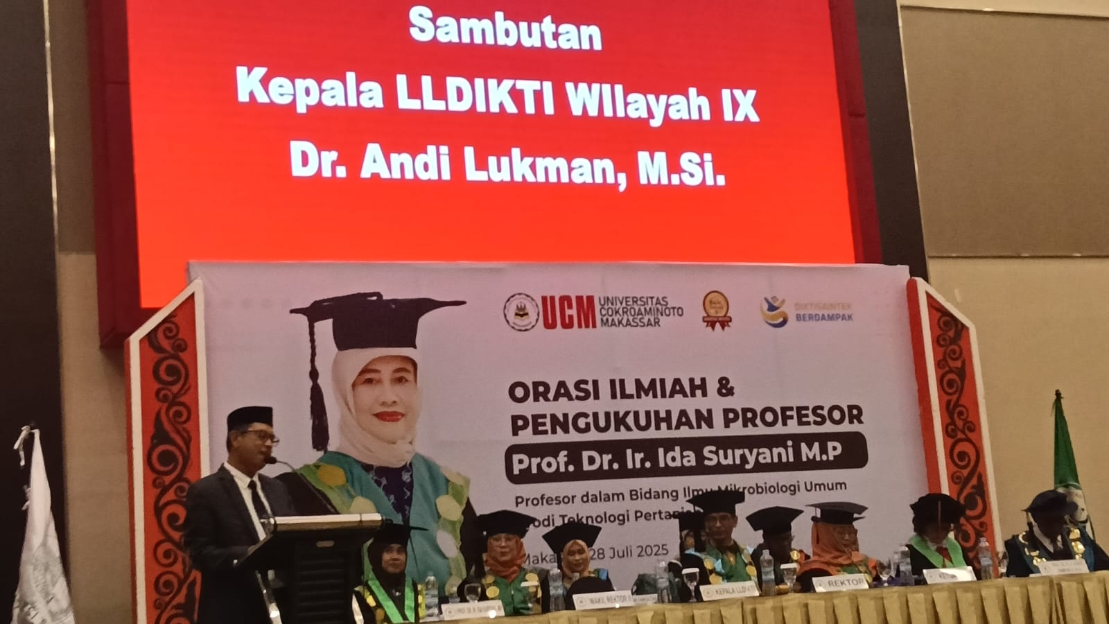 Demikian ditegaskan Kepala LlDIKTI Wilayah IX, Dr Andi Lukman, M.Si saat memberi sambutan pada pengukuhan Guru Besar Wakil Rektor I, Dr Ir. Hj. Ida Suryani MP. Rapat senat luar biasa ini dipimpin Rektor Universitas Cokroaminoto Makassar (UCM), Dr Lukman Daris, S.Pi, M.Si, Senin 28 Juli 2025 di Hotel Dalton Makassar.