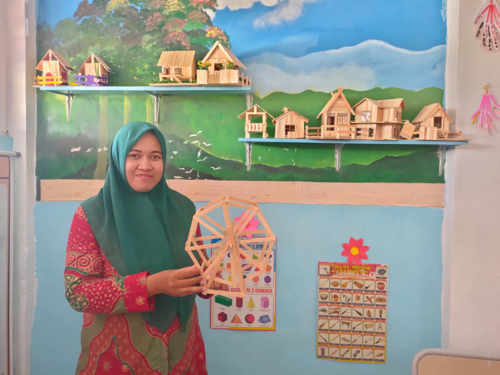Nur Qalbi, S.Pd, wali kelas 6A dan Marhana, S.Pd, wali kelas 6B, memperlihatkan karya daur ulang di kelasnya. Ada yang merupakan prakarya, media pembelajaran, maupun dekorasi pojok baca.