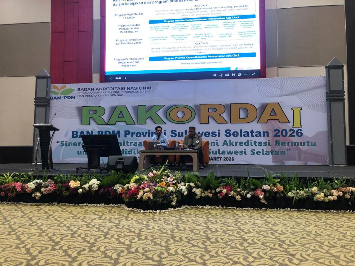 Rakorda I BAN-PDM Sulsel yang berlangsung mulai 13 hingga 15 Maret 2026 ini, Kepala BBPMP Sulsel memaparkan materi “Kebijakan BBPMP dalam Mendorong Peningkatan Mutu Satuan Pendidikan.
