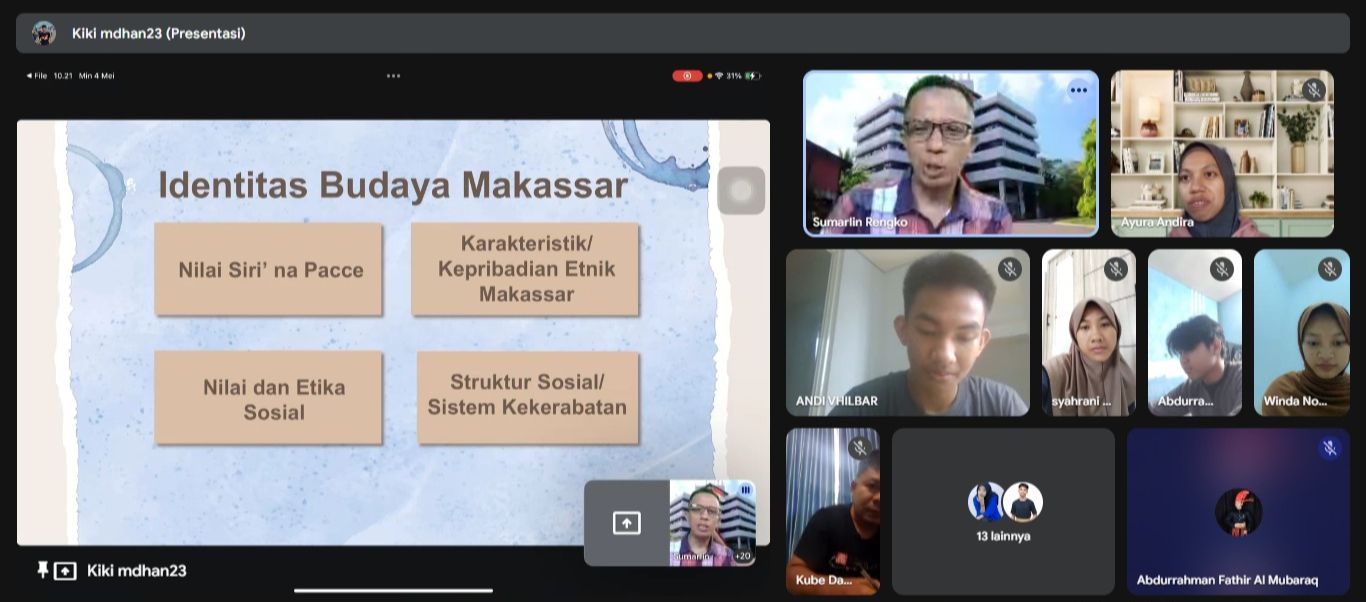 Sementara itu, Pemateri Dr. Sumarlin Rengko HR, S.S., M.Hum. menguraikan bahwa Identitas budaya dan kosmologi etnik Makassar memiliki keunikan tersendiri yang kaya akan nilai-nilai lokalitas dan warisan leluhur yang masih dijunjung tinggi oleh masyarakat Makassar hingga saat ini, seperti budaya Sirik napacce.