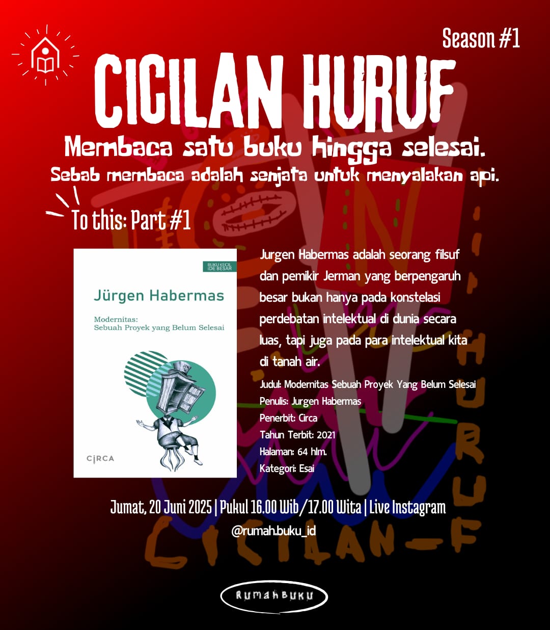 Tanpa cicilan huruf yang diinspirasikan oleh yang baru, tagihan keabadian tidak akan pernah mengkristal. Cicilan Huruf adalah proyek yang belum selesai. Begitulah Rumah Buku memperkenalkan project barunya dengan mengangkat buku Jurgen Habermas. Semoga ini menjadi langkah klasik yang bakal menghasilkan kesadaran radikal tentang semua koneksi historis apa pun sebelumnya. Gerakan literasi bukan Romantisme abstrak dari sejarah keseluruhan. Tutup Musakkir Basri.