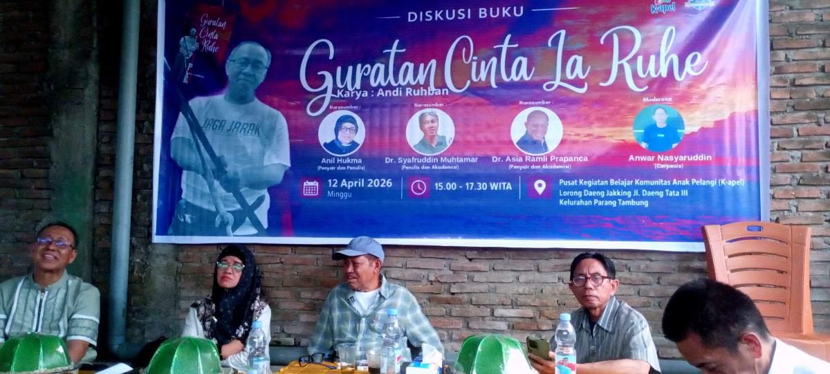 NusantaraInsight, Makassar — Seperti denyut nadi yang tersembunyi di balik lapisan waktu, buku Guratan Cinta La Ruhe karya Andi Ruhban menggema dalam diskusi hangat di Pusat Kegiatan Belajar Komunitas Anak Pelangi (K-apel) Lorong Daeng Jakking, Jl. Daeng Tata III, Kelurahan Parangtambung, Minggu (12/4/2026).