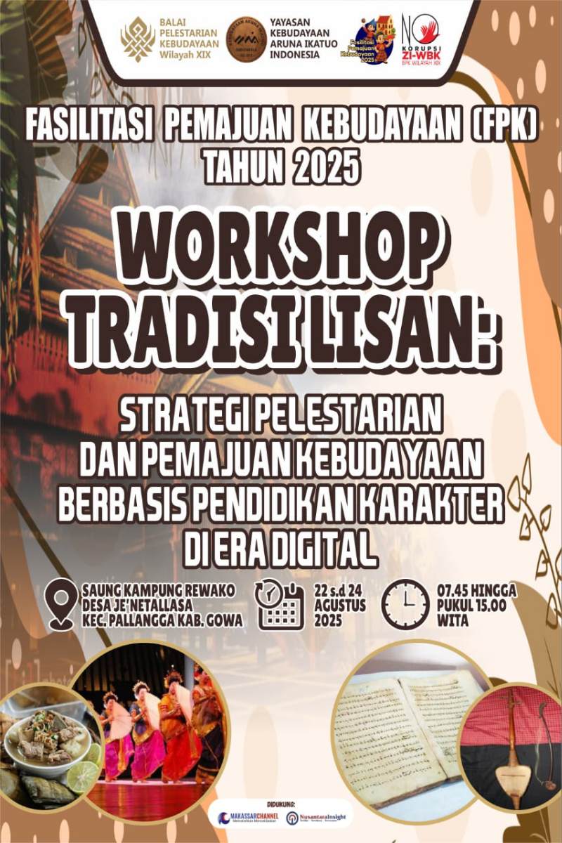 NusantaraInsight, Gowa — Dalam upaya menjaga denyut kebudayaan di tengah arus modernitas, Yayasan Kebudayaan Aruna Ikatuo Indonesia menyelenggarakan Workshop Tradisi Lisan: Strategi Pelestarian dan Pemajuan Kebudayaan di Era Digital. Kegiatan ini berlangsung selama tiga hari, Jumat hingga Minggu (22–24 Agustus 2025), di Saung Kampung Rewako, Desa Jenetallasa, Kabupaten Gowa, sebagai bagian dari program Fasilitasi Pemajuan Kebudayaan (FPK) 2025 yang digagas oleh Balai Pelestarian Kebudayaan (BPK) Wilayah XIX.