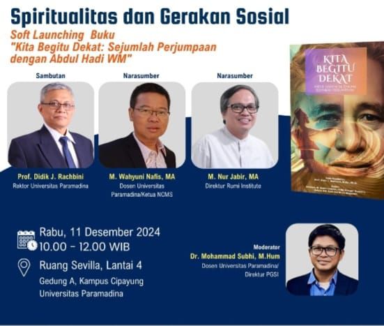 Acara yang akan berlangsung pada Rabu, 11 Desember 2024 pukul 10.00-12.00 WIB di Ruang Sevilla, Lantai 4, Gedung A, Nurcholish Madjid, Universitas Paramadina, Cipayung ini akan menghadirkan narasumber: M. Wahyuni Nafis (dosen Universitas Paramadina), M. Nur Jabir (Direktur Rumi Institute), dan akan dipandu langsung oleh Dr. Mohammad Subhi-Ibrahim, M.Hum..
