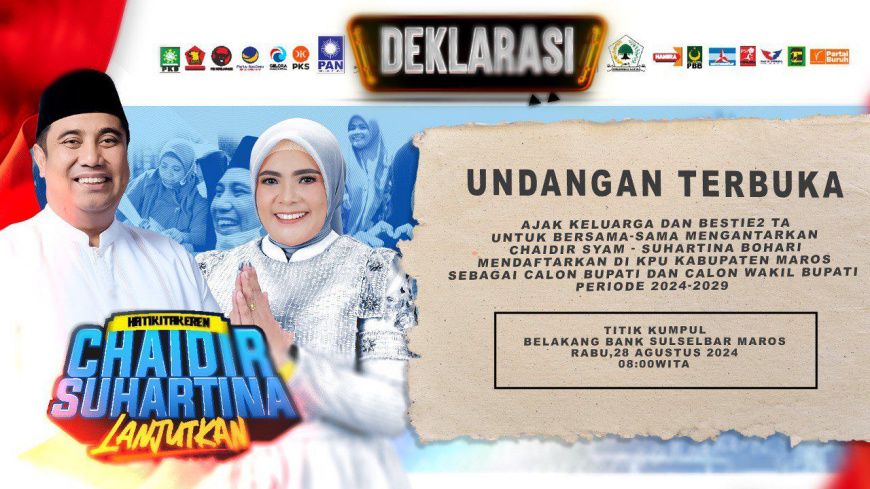 “Dalam sampul undangan terbuka deklarasi pasangan Keren Lanjutkan jilid II, Chaidir Syam Suhartina Bohari kepada masyarakat Maros, berisi ajakan untuk keluarga dan Bestie-bestie ta untuk bersama-sama Chaidir Syam Suhartina Bohari, mengantar ke KPU Maros mendaftar Sebagai calon Bupati dan Wakil Bupati Maros 2024-2029.
