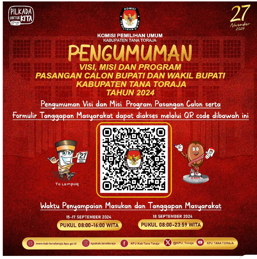 Menindaklanjuti surat dinas Ketua KPU Republik Indonesia nomor : 2006/PL.02.2SD/06/2024, pada tanggal 9 September 2024 perihal Publikasi Visi, Misi dan Program Pasangan Calon, KPU Kabupaten Tana Toraja mengumumkan visi, misi dan program pasangan calon, sebagai berikut :