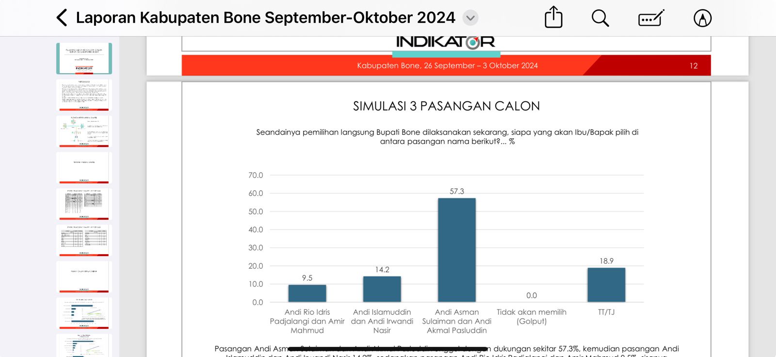 Tercatat, dalam laporan lembaga survei nasional ini, paslon Andi Asman Sulaiman-Andi Akmal (Beramal) melejit dengan capaian elektabilitas 57,3 persen. Disusul paslon Andi Islamuddin-Andi Irwandi Natsir 14,2 persen. Di urutan ke-3, Andi Rio Padjalangi-Amir Mahmud dengan angka 9,5 persen. Sedang responden yang tidak menjawab/tidak tahu sebesar 18,9 persen.