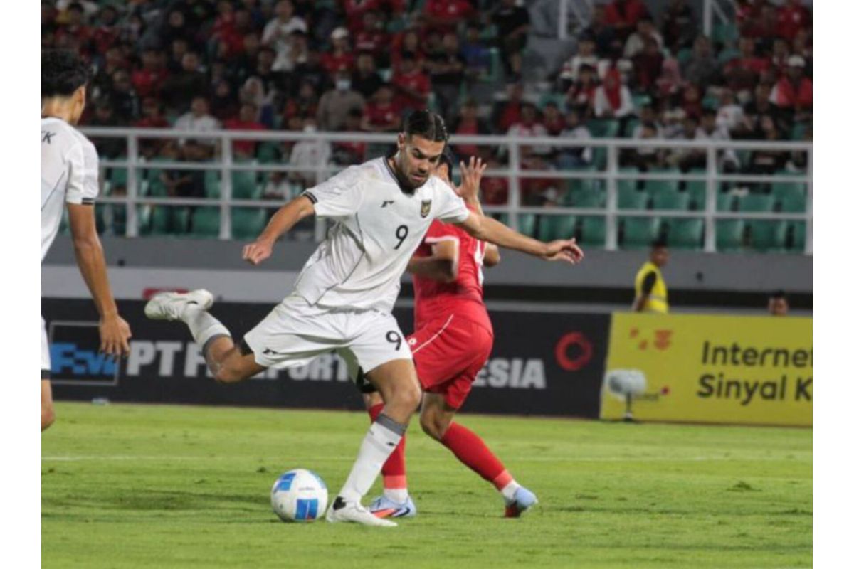 Rafael Struick yang berkali-kali memperoleh peluang menggiring bola seorang diri, namun selalu berhadapan dengan blokade pemain lawan.
