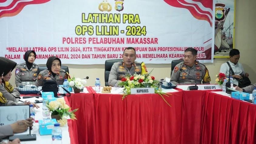 NusantaraInsight, Makassar — Dalam rangka mempersiapkan pengamanan Natal 2024 dan Tahun Baru 2025, Polres Pelabuhan Makassar menggelar kegiatan Latihan Pra Operasi (Lat Pra Ops) Lilin 2024. Dengan mengusung tema, “Melalui Latihan Pra Operasi Kita Tingkatkan Kemampuan dan Profesionalisme Polri dalam Pengamanan Natal 2024 dan Tahun Baru 2025, Guna Memelihara Keamanan Dalam Negeri,” kegiatan ini dipimpin langsung oleh Kapolres Pelabuhan Makassar, AKBP Restu Wijayanto.