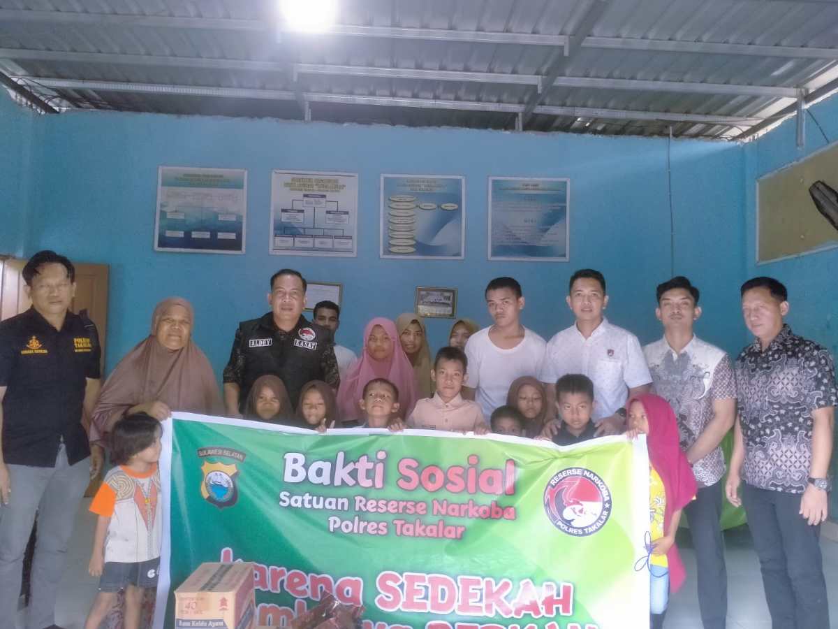NusantaraInsight, Takalar — Satuan Reserse Narkoba Polres Takalar melaksanakan kegiatan bakti sosial di Panti Asuhan Mega Mulia, Lingkungan Bontokassi, Kelurahan Panrannuangku, Kecamatan Polombangkeng Utara, Kabupaten Takalar.